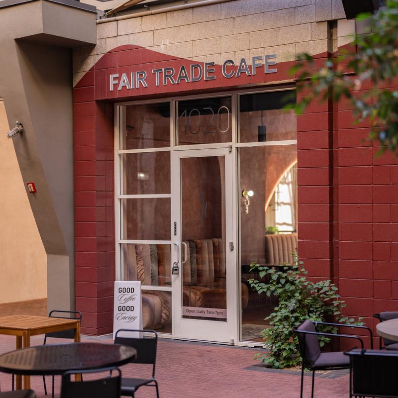 Fair Trade Cafe is conveniently located in Downtown Phoenix, Arizona where we serve shade-grown, organic fair-trade coffee and offer an assortment of in-house baked goods, artisan crafted sandwiches, and an unmatched menu of delicacies. Come to study, check our local rotating art gallery, or even take part in our collaborative community events.